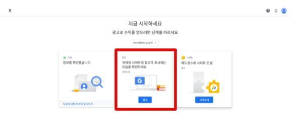 애드센스 홈에서 가장 오른쪽에 위치한 '애드센스에 사이트 연결' 항목의 '시작하기' 버튼을 눌러주세요.