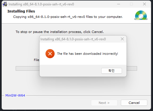 오류 발생 설치 중 오류 발생함. 오류 메세지: The file has heen downloaded incrrectly!